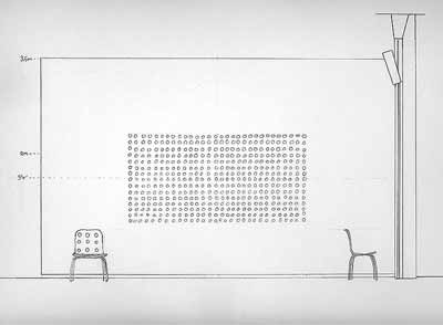 Proposal for installation of 450 Rich Tea biscuits nailed to a wall in a grid. The biscuits are arranged 30 biscuits across by 15 high, and occupy an area of 3 x 1.5m. The grid is centred at a normal viewing height of 1.55m and positioned horizontally in the centre of the wall space.