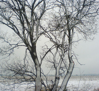 It seems that the wind must blow so consistently in one direction here that snow affixes itself to the sides of trees, I also noticed, on my way home. |