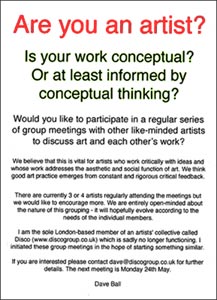 The experiment was to see what would happen if the term "conceptual art" was used to bring together a group of artists with a certain agenda; artists who, in some sense, saw themselves as "conceptual artists". Amongst those who got involved were the following: Birgit Medele, Ana Moring, Russell Thoburn, Hannah Brown, Jang Young Jo, Iain Lonsdale, Dave Ball, Sally Wright, Alec Dunnachie, Jon Dew, Tomas Graveson, and also Nerys, Maria, Liam and a few others whose names have escaped us. "It's