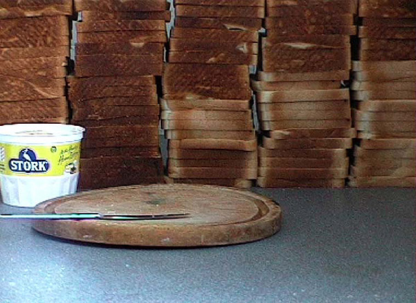 Video, six minutes. A large pile of bread in the background of the shot is gradually buttered and transferred to a new pile in the foreground, which eventually fills the screen. With music by Erik Satie.