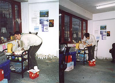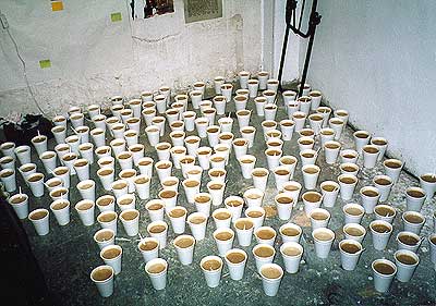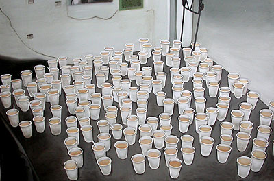 Performance/installation. Tea is made continuously for two hours, with the approximately 200 cups laid out on the floor, or handed out to gallery visitors when requested.