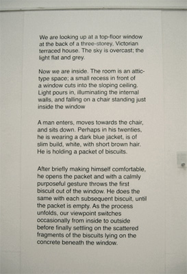 Performative work for video, two minutes. A second-floor window of a terraced house is open. Inside, adjacent to the open window, lies a chair. Whilst sitting on the chair a packet of biscuits is opened. One by one the biscuits are thrown out of the window until the packet is empty.