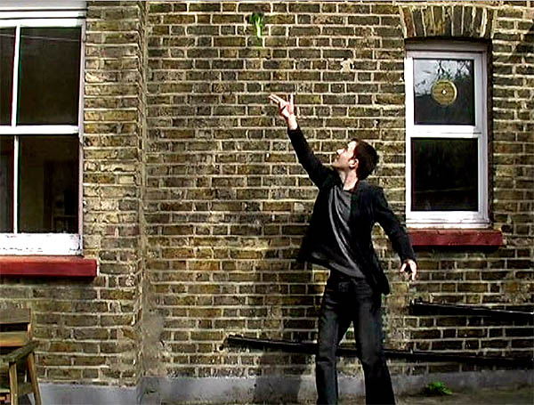 Performance for video. A piece of broccoli is repeatedly thrown vertically into the air, so as to leave the frame of the video.