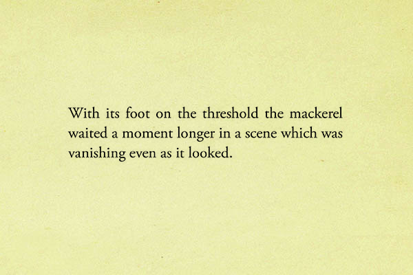 The work chronicles a journey made by a mackerel from a residential building in Berlin to a nearby stretch of canal. Texts describing the mackerel’s innermost thoughts accompany images of its passage through the city. The texts are based on the interior monologues of Mrs Ramsay in Virginia Woolf’s novel To the Lighthouse.