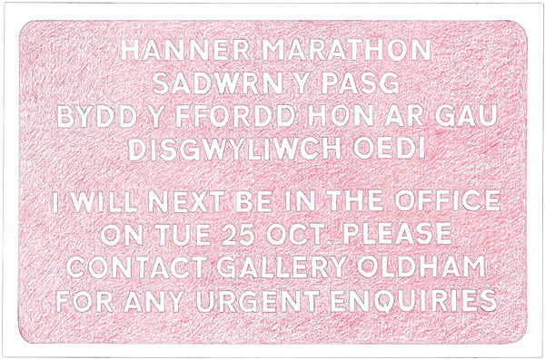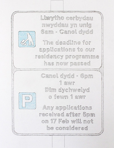 The Dragon’s Tongue imagines the situation in reverse: the drawings present proposals for signs in which the Welsh text gives straightforward instructions to travellers, whilst the emailed English translation veers off into a different realm of experience altogether.