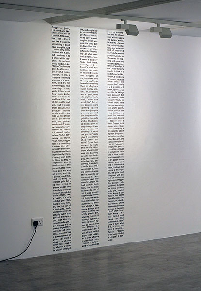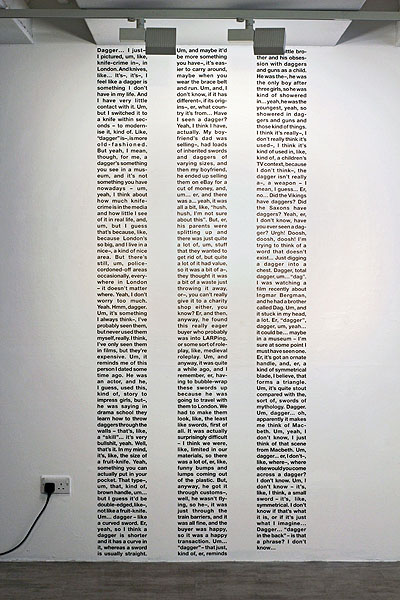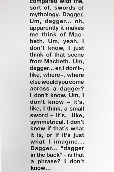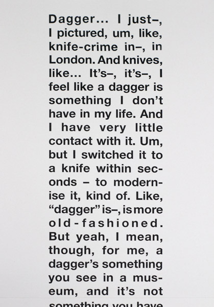 Based on a series of interviews conducted with participants whilst walking in the countryside in Northumberland, UK. Prompted with consecutive words from the “D” section of the Concise Oxford English Dictionary, interviewees were requested to speak spontaneously about the word, with no other specific instruction given. Untitled (Dagger) comprises the responses of six different participants to the word “dagger”, transcribed in full.
