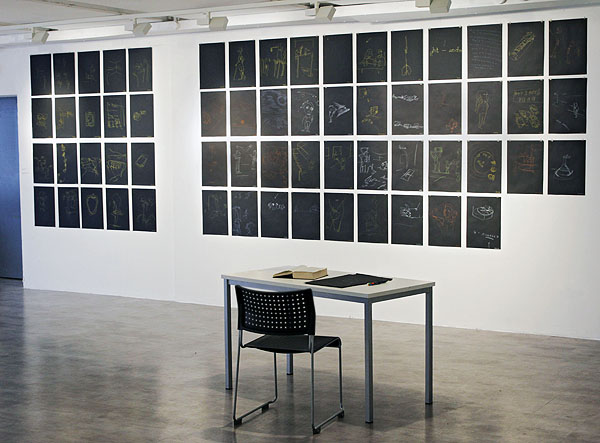 The installation featured selected images from the first three instalments of the A to Z project, storage boxes, desk, drawing materials, dictionary, and the first 63 images from the most recent instalment, A to Z: The Ds (Blind Drawings).