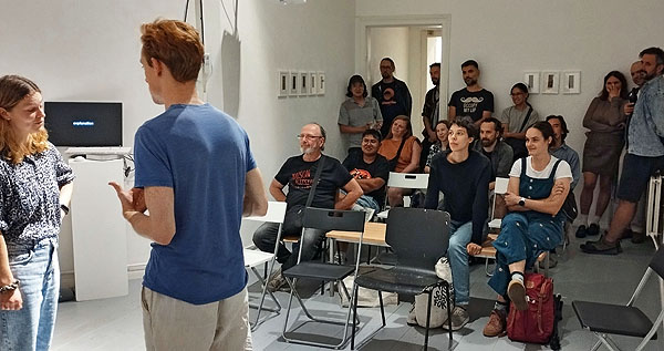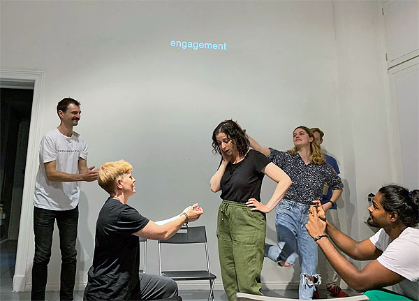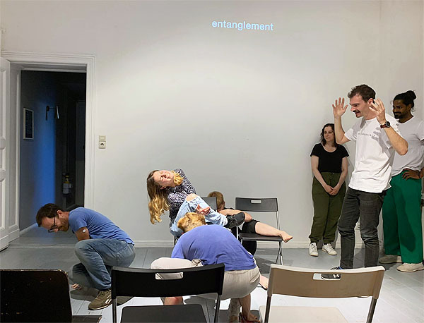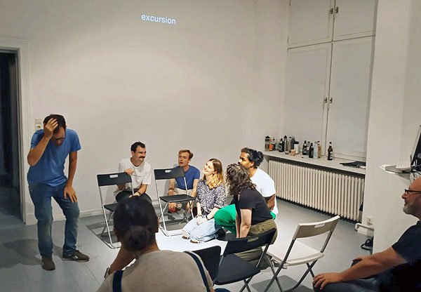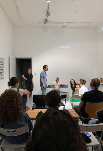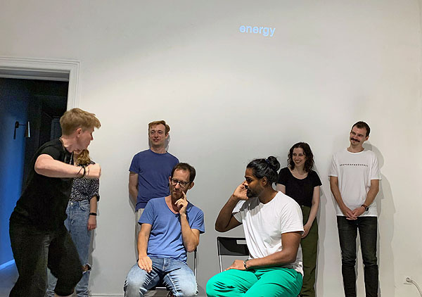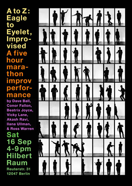 Performance with Conor Fallon, Beatrix Joyce, Vicky Lane, Akash Ravi, Ilana Ullman and Ross Warren in which, over a duration of five hours and nine minutes, a one-minute-long improvised scene was performed for each of the 309 “E”-words in the dictionary. Performed at HilbertRaum, Berlin on 16 Sep 2023 as part of the exhibition When Words Fail.