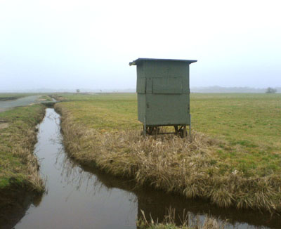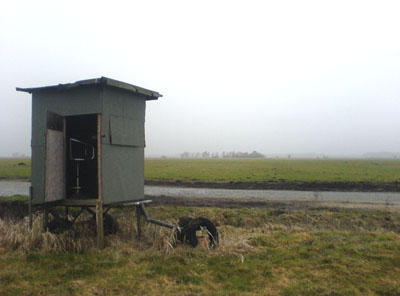 So the thing that has held several compositions together - up till now rather anonymously it must be said, even mysteriously - turns out to be a bird watching hut. It has a bar-stool in it that swivels, and the walls inside are covered with carpet. The door of this one wasn't locked either so I was able to go inside. I opened a couple of the windows with a great effort (they weren't as well designed as the previous hut), sat on the stool for a while, but mainly I felt a bit bored. Someone on horseback appeared to be approaching me at one point, but turned round before they got close. The hut felt like a meaningless distraction. I wished I could go back to not knowing what it was.