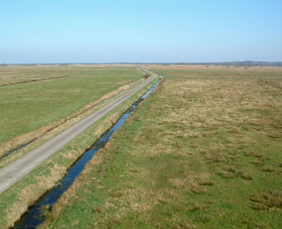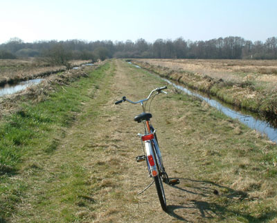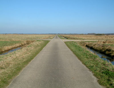 This road in particular interested me. When I'd finished looking at it from up here, I climbed down and cycled along its length. The headwind made the journey quite difficult, even though it was totally flat. As an experiment I tried going in the other direction: I noticed that it was possible to "sail" along, moving purely by the force of the wind, without pedalling at all. I found I was making very slow progress however, so I didn't pursue that for long.