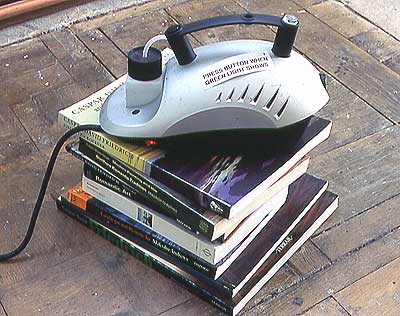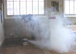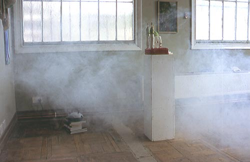 Installation of smoke machine and pile of books on Casper David Friedrich and Romantic landscape painting.