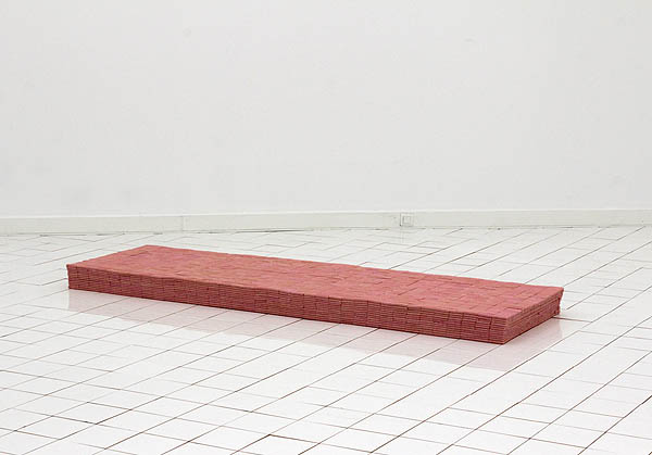Floor-based installation of 12,168 pink wafer biscuits arranged to same dimensions as Carl Andre's 1966 work Equivalent VIII ("the Tate bricks"); 2.24 x 0.67 x 0.12 m.