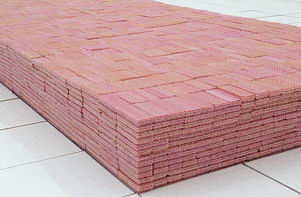 I had recently finished art college and scholarly exegeses on minimalism were still echoing around my head: it was about one’s own phenomenological presence as a spectator in the room; it was an intentionally uncompromising experience that denied conventional aesthetic pleasure, narrative interest, and symbolic content; it had since been (mis-)appropriated as a vacuous interior design concept. But for me, it also had a kind of compelling banality. I had been using biscuits a lot in my own work at the time, drawn to their resolute lack of seriousness; as a sculptural material they seemed a bit pathetic: the polar opposite of the austere minimalist brick. If minimalism sought to exclude everything that detracted from the facticity of the object in a space, then pink wafers were wholly inappropriate, filling the room with their sickly saccharine aroma, gaudily pink, initiating semi-ironic discussions of “what’s your favourite biscuit?” But still, they were sort of brick-shaped, and they stacked quite nicely...