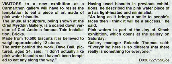 ‘Dave’s tickled pink!’ announced the headline on the cover of the Carmarthenshire Journal. There was something inevitable about the way the local newspaper chose to focus on this one particular work in its coverage of a group exhibition at Oriel Myrddin Gallery in Wales entitled ‘The Joy of Kitsch.’ Carl Andre’s original had, of course, triggered something of a media storm back in the 1970s when the Tate purchased it. ‘What a load of rubbish!’ exclaimed the Daily Mirror’s indignant article, besides a series of photographs of the work – which was how, reproduced on the pages of some art history textbook or other, I first encountered it.